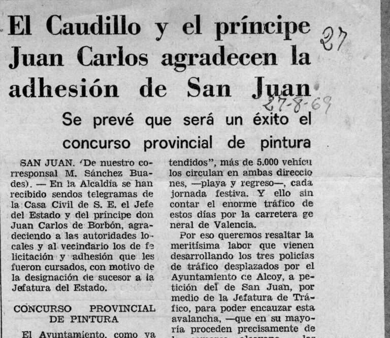 El Caudillo y el príncipe Juan Carlos agradecen la adhesión de San Juan. Concurso de pintura