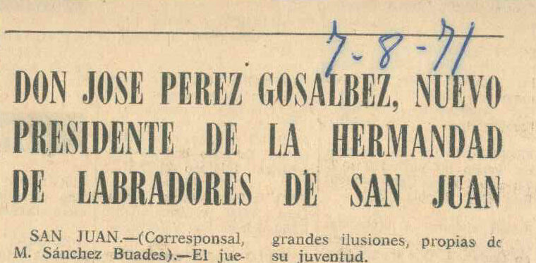 Don José Pérez Gosálbez, nuevo presidente de la hermandad de labradores