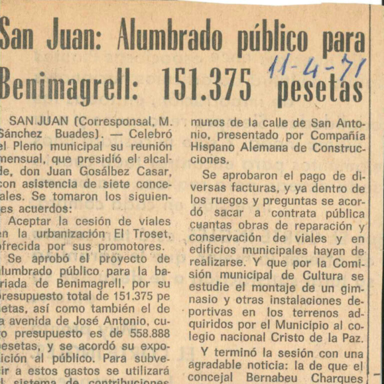 Alumbrado público para Benimagrell: 151.375 pesetas